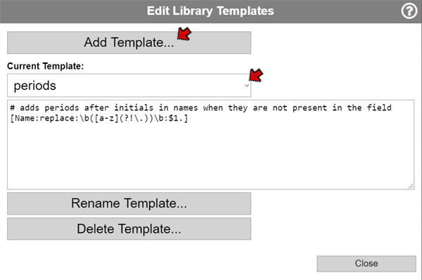 In the Edit Library Templates screen that opens, click the Add Template... button to add a new Template, or select the name of an existing one from the drop-down list to edit it: