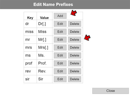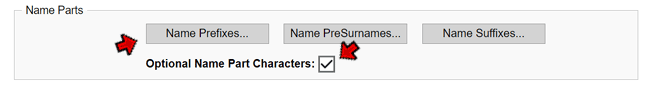 Here we see the three buttons that open the Prefixes, PreSurnames, and Suffixes list. Also shown is the check box for the Optional Name Part Characters. If we click, for example, the Name Prefixes button, the Edit Name Prefixes screen, as shown on the right, appears.