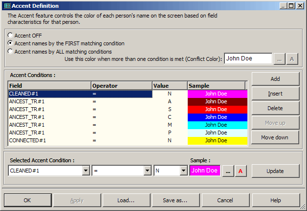 You turn on Accents by selecting the second or third option at the top of the screen, instead of "Accent OFF." Generally the second option – First matching condition – is best. It is somewhat quicker when you change focus to a new person as TMG can stop searching once it finds a condition that matches those specified. And generally it provides the desired result, as described in my Example, below.