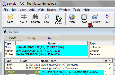 To attach a file as an Exhibit, first place the file in the folder you intend to use for your Exhibits. Then open the Exhibit Log associated with the location where you want to attach the Exhibit. If you intend to attach the Exhibit to a person, make that person the focus, then click the "Exhibits" icon on the toolbar:
