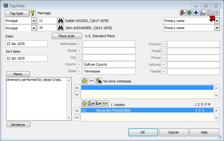 If you intend to attach the Exhibit to an Event, Citation, Source, or Repository, open the data entry screen for that item. For example, to attach to an Event, open the Tag Entry screen for that Event, and click the camera (Exhibits) icon at the upper right corner of that screen: