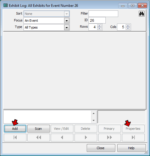 If you have the Exhibit file visible in Windows Explorer, you can drag it into large square in the middle of the Exhibit Log and drop it there. Or, you can click the Add button, and when the Select File dialog opens select the file and click the Open button to attach the file. In either case you may wish to us the Properties button to open the Properties dialog and enter a description and/or caption.