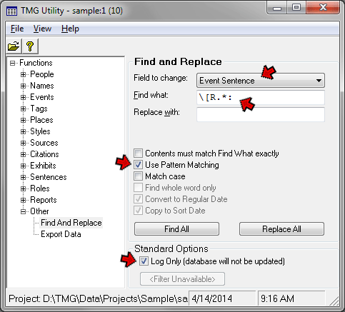 For this test, use the Search and Replace feature, as shown below, and then examine the resulting log: