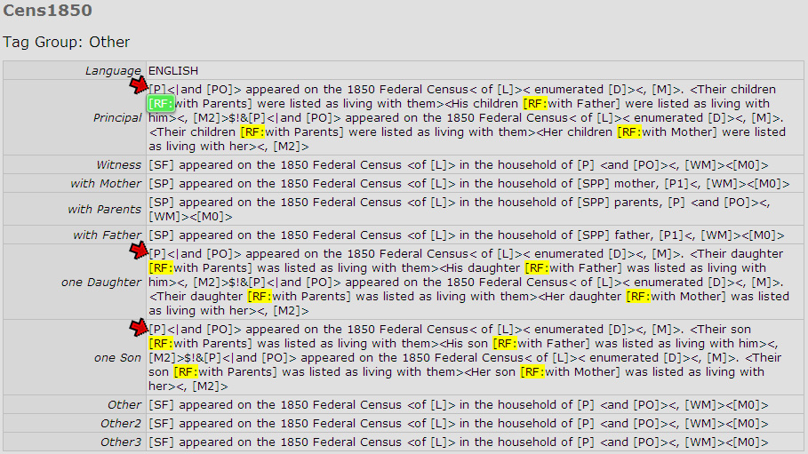 When you locate a Sentence that uses these Variables, first look at the Role to see whether it is one you might use for Principals. In this case I would only use the "Principal," "one Daughter," and "one Son" Roles for Principals, so I examine only those Roles to see if the [RF:rolename] Variable refers to the subject of the Role. In each of those three Roles above the [P] Variable is used to refer to the subject, so there is no issue with this Tag Type. I would continue to examine other Tag Types.
